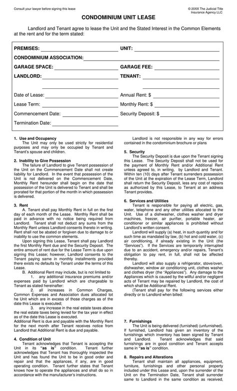 Before signing a lease agreement for a condo unit, it's crucial to carefully review and understand the terms and conditions. The lease agreement should outline the monthly rent, lease duration, security deposit requirements, and any additional fees, such as maintenance or parking fees. Pay close attention to any restrictions or rules set by the condominium association, such as noise regulations or restrictions on making alterations to the unit.
